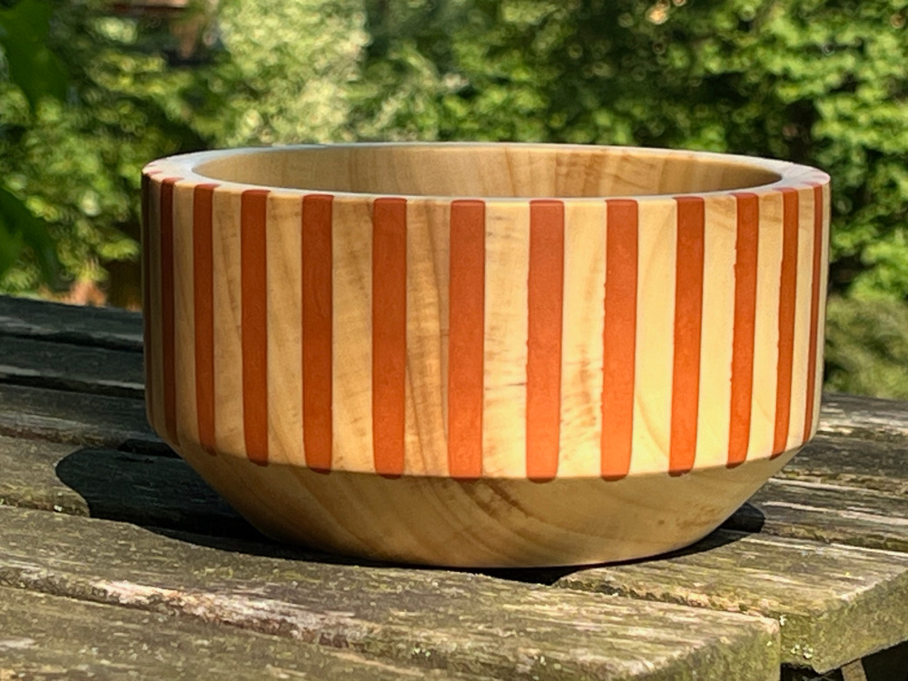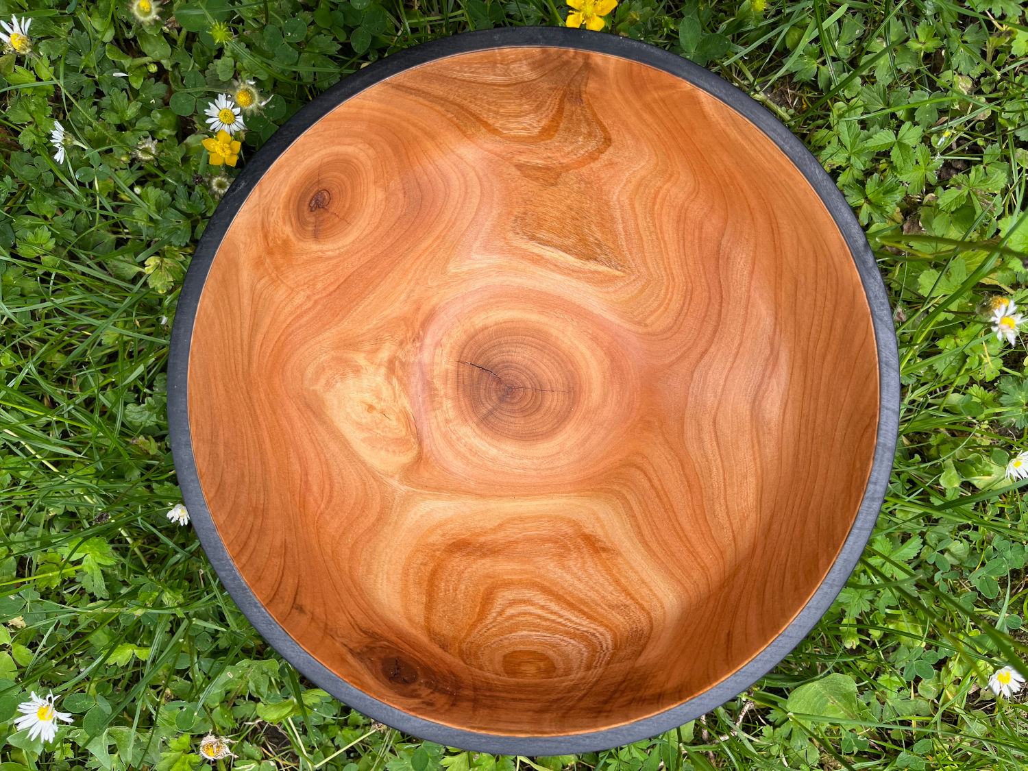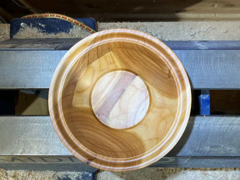 Eine etwas kleinere Schale, nett gezeichnet durch einen deutlichen Kontrast zwischen Kern- und Splintholz. Die Kirsche ist einfach immer eine Hübsche! Leider sind die verfügbaren Stämme meist recht dünn, weil die Bäume oft nach zu kurzer Zeit gefällt werden. Daher: Lasset die Kirschen älter werden! Und schenkt sie dann mir ;))