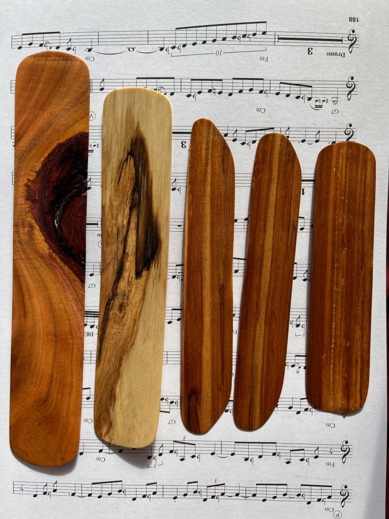Wenn Holz sehr dünn zugearbeitet wird (unter 1 mm), wird es erstaunlich biegsam. Es lässt sich dann auch zum Beispiel als Lesezeichen verwenden. Ich verwende dafür Stücke mit Fehlern (Asteinschlüsse, Verstockungen, …), denn die sind sehr dekorativ. Problem dabei: die brechen auch leicht auseinander, daher überleben oft nur die Hälfte der Stücke das Sägen, Hobeln und das viele, viele Schleifen. Und auch die Grösse und Form der Endprodukte ist kaum prognostizierbar. Aber fesch sind sie natürlich!