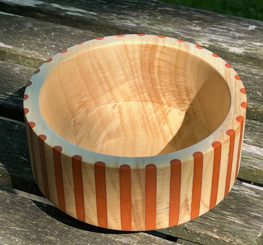 Hm, natural edge bowls, das ist ein bisserl schwer zu erklären ohne Skizzenblock. Im Wesentlichen drechselt man so, dass die Aussenseite des Baumstammes bei der Schale oben zu liegen kommt (für GeometrikerInnen: der Mantel des Zylinders). Schaut jedenfalls fetzig aus! Ist kreisrund, versprochen – das längsovale ist eine optische Täuschung. Wer’s nicht glaubt, kann gern nachmessen.