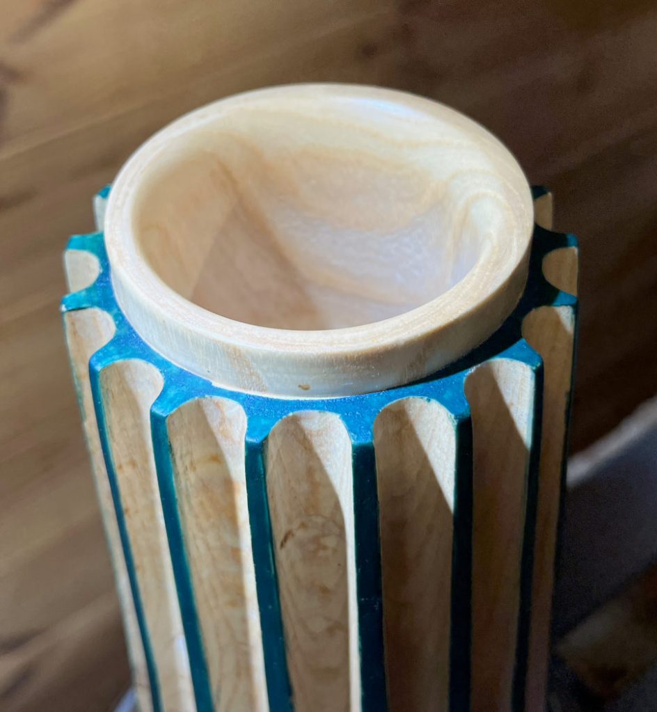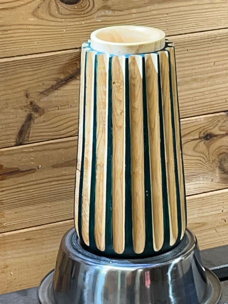 Mein erster Versuch mit Fräsen auf der Drechselbank. Schaut schon ganz gut aus, oder? Die Farbe ist grüner (weniger blau) als abgebildet; das Licht in der Werkstatt ist etwas zu hart zum Fotografieren. Im Inneren befindet sich ein Fläschen, das sich mit Wasser für lebende Blumen füllen lässt.