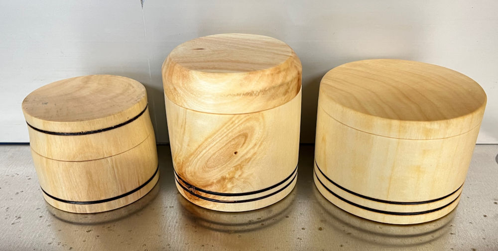 Meine ersten (gelungenen) Dosen! Vielleicht für Eure Brillanten, die kleineren halt? Dosen sind eigentlich nicht viel aufwändiger als Schalen oder Teller, aber das genaue Einpassen der Deckel erfordert ein bissl Übung. Die drei sind recht ähnlich, der Unterschied liegt in der Herstellung des Deckelfalzes (innen/aussen) und im Maserungsverlauf (a und c sind aus einem, b aus zwei Stücken). Wenn es Nachfrage gibt, will ich in Zukunft mehr davon machen, auch grössere Exemplare. Erste Rohlinge trocknen schon.