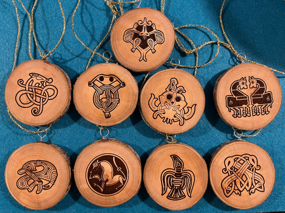9 Christbaum”sterne” mit Original-Wikingermotiven (Kirsche), Durchmesser 6 cm
