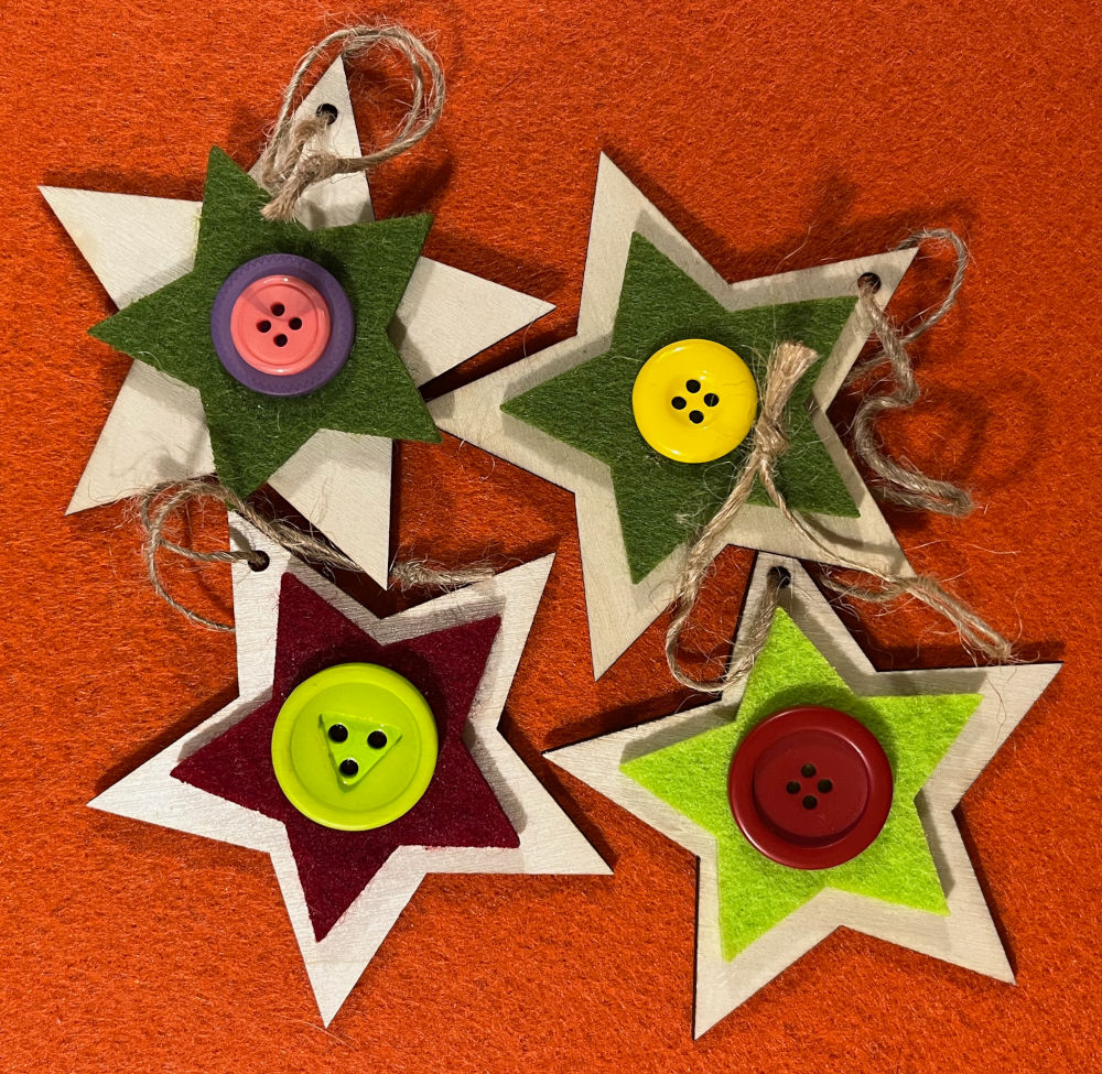 20 Christbaumsterne diverse Farben (Sperrholz, Filz, Knöpfe), Durchmesser 8 cm